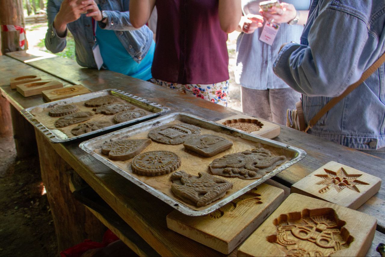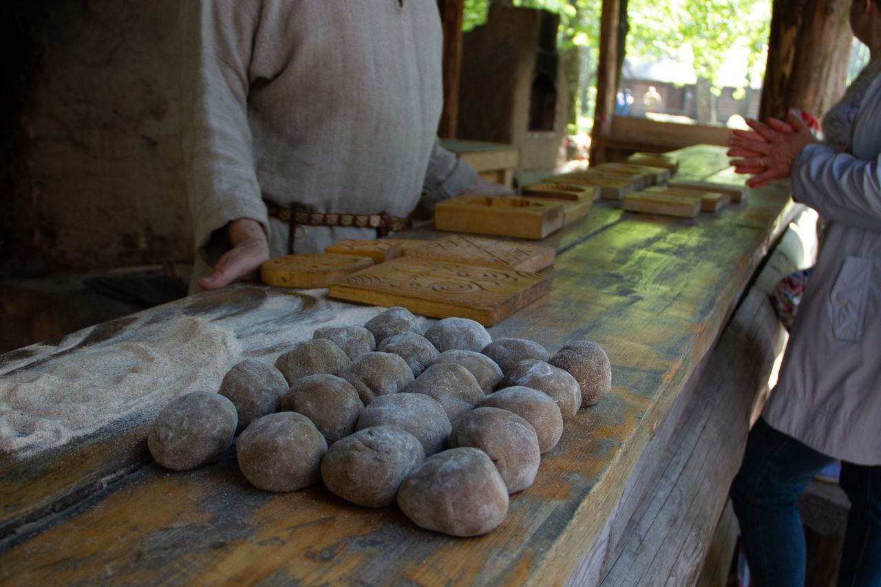 В корчме, расположенной в центре музея, находится купольная глиняная печь по образцу тех, которыми тысячу лет назад пользовались племена северян, радимичей и кривичей. Печь находится в рабочем состоянии и на ней уже несколько лет готовят еду. Именно тут прошел кулинарный мастер – класс по изготовлению печатного древнерусского пряника. Наши сотрудники смогли из заранее подготовленного медового теста сделать себе пряники, форму и узоры которых создавали в специальных резных досках.