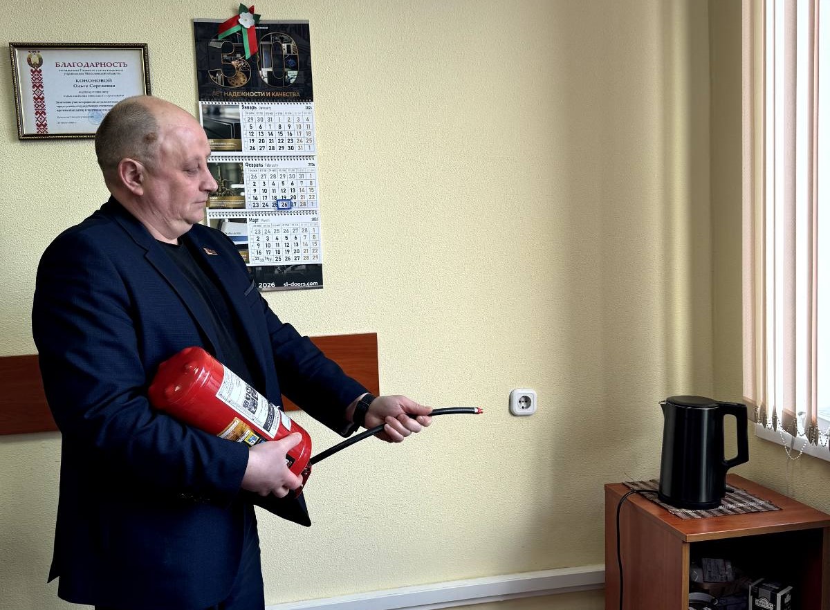 Работники структурного подразделения, в котором «возник очаг возгорания», на практике закрепили алгоритм действий в чрезвычайной ситуации: попытаться погасить пожар самостоятельно с помощью огнетушителя; сообщить о возникновении пожара в службу 101 или 112, начальнику Главного управления и командиру пожарной дружины; оповестить людей о пожаре, включив систему оповещения.