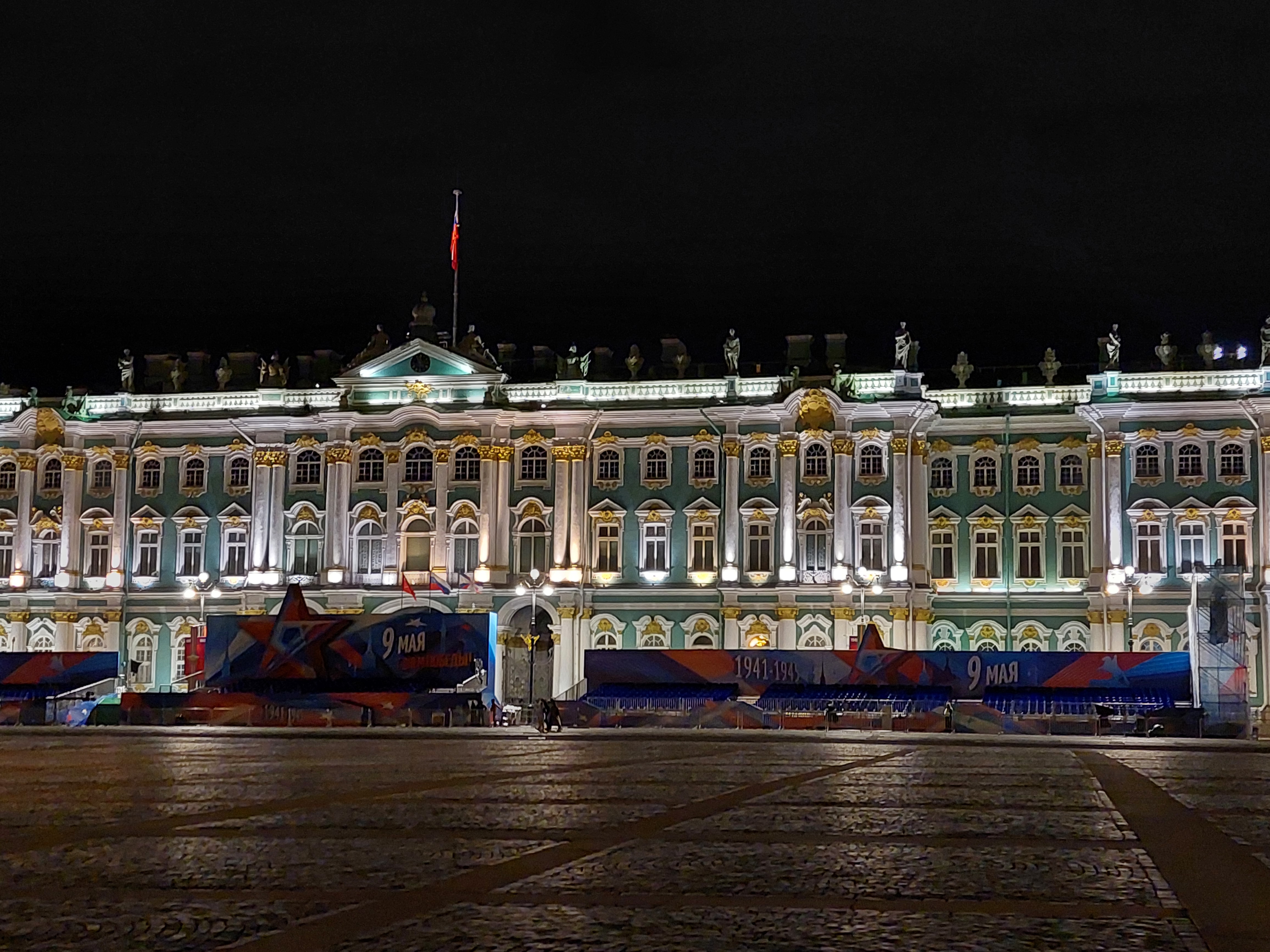 - прогулка по Дворцовой площади, которая в своем убрании готовилась к празднованию Дня Победы