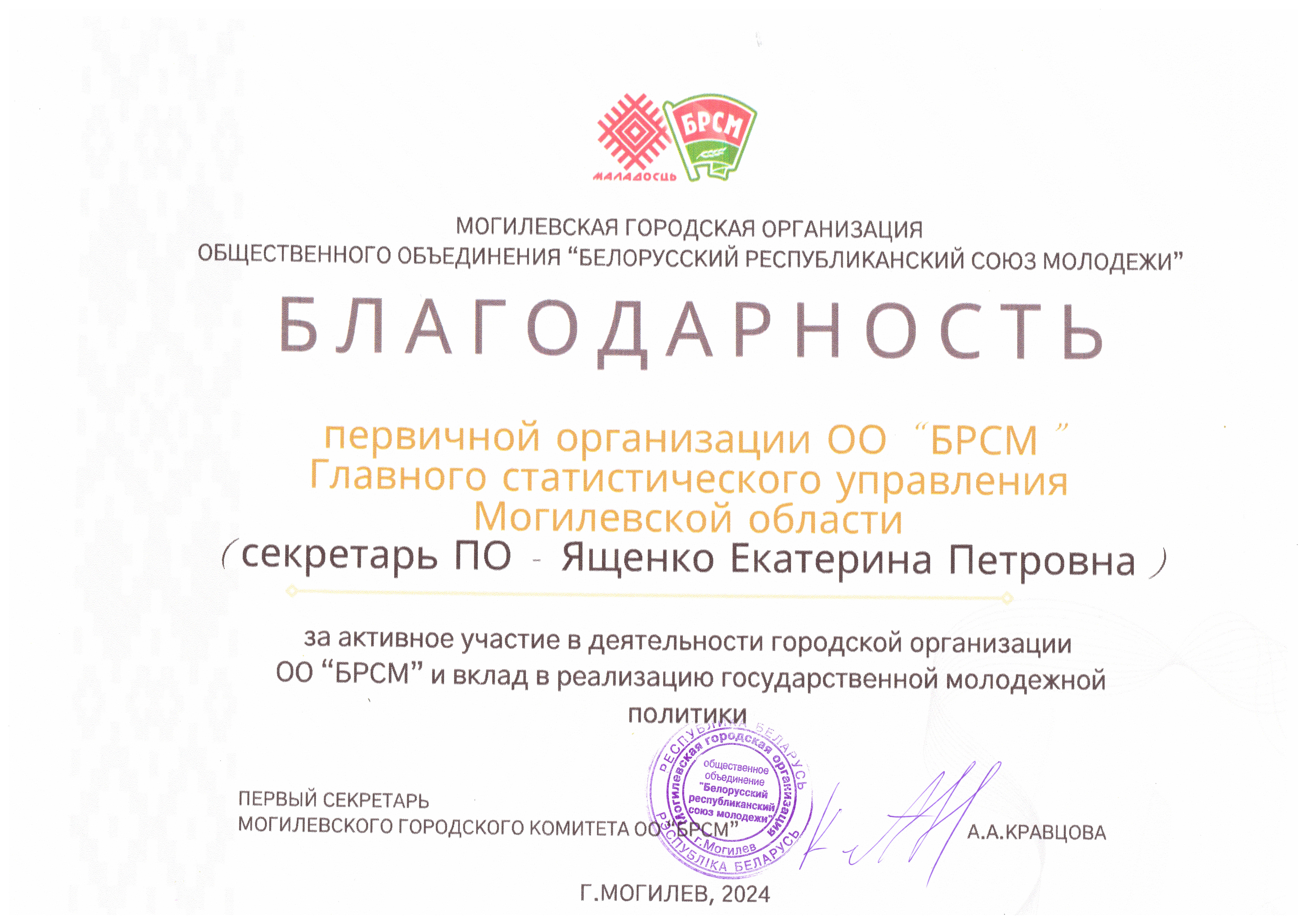 За активное участие в деятельности городской организации ОО «БРСМ» и вклад в реализацию государственной молодежной политики первичной организации ОО «БРСМ» Главного статистического управления Могилевской области объявлена БЛАГОДАРНОСТЬ Могилевской городской организации ОО «БРСМ».