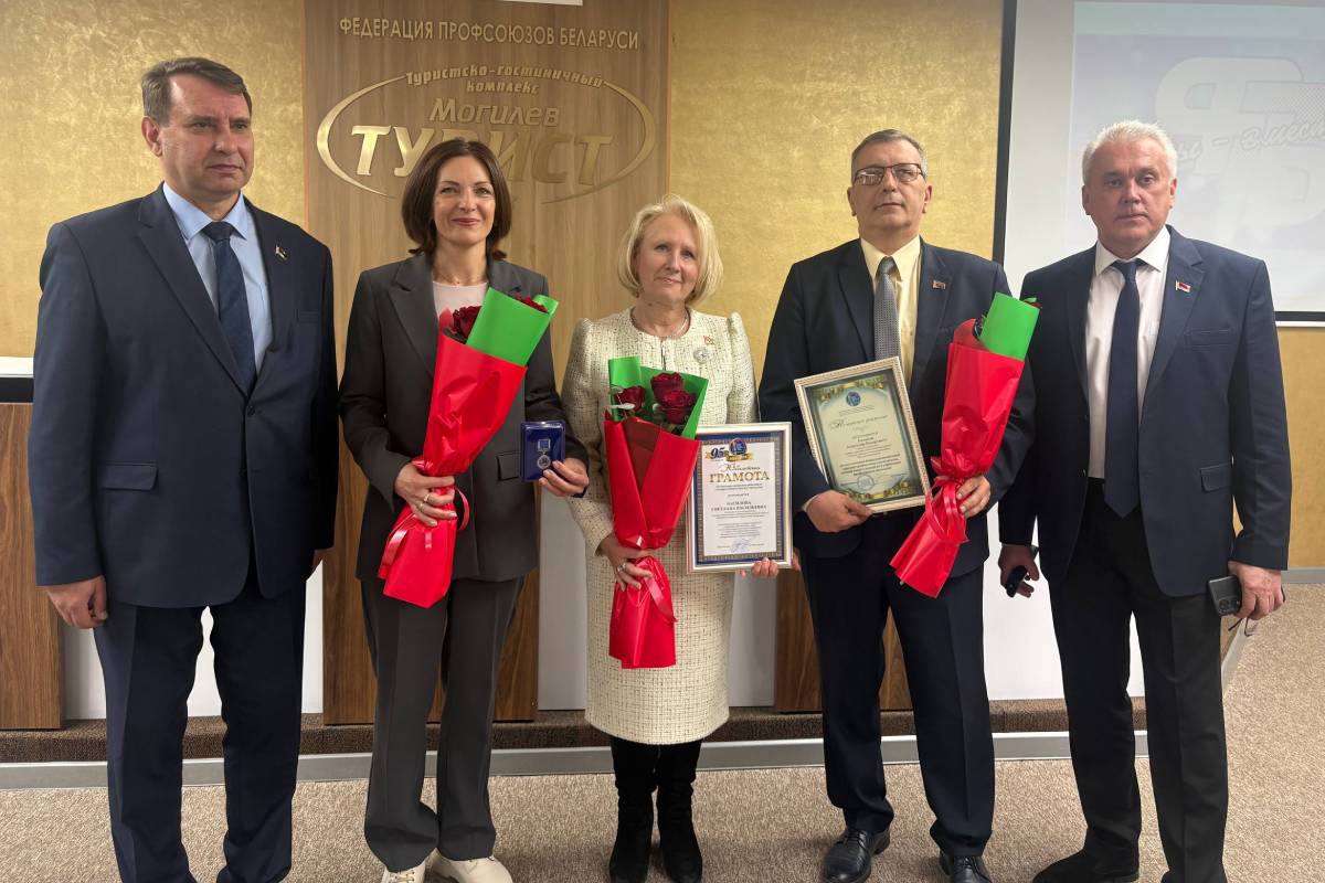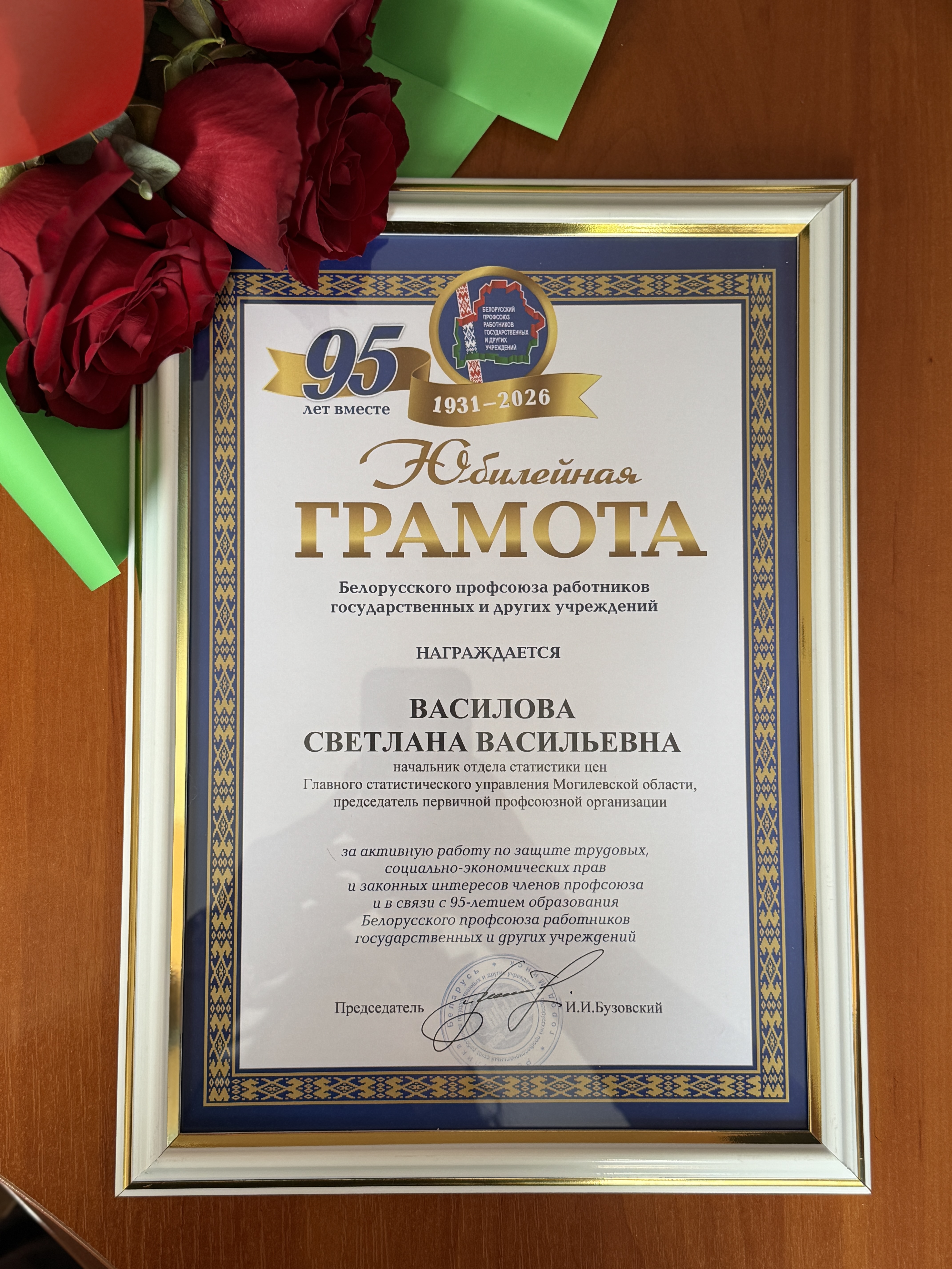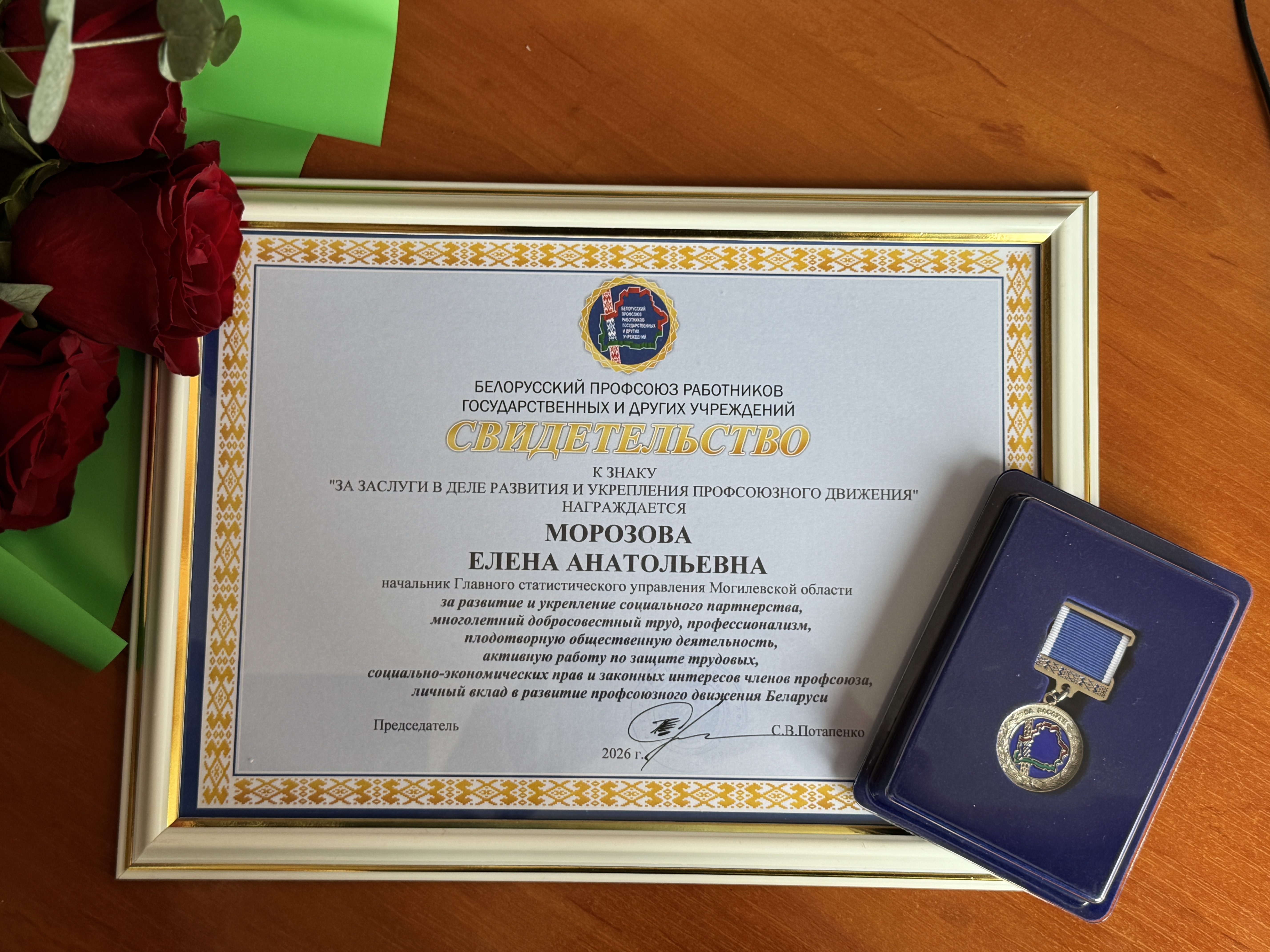 председателя Белорусского профсоюза работников государственных и других учреждений Юрий Чернуха вручил начальнику Главного управления Елене Морозовой Знак «За заслуги в деле развития и укрепления профсоюзного движения» за развитие и укрепление социального партнерства, многолетний добросовестный труд, профессионализм, плодотворную общественную деятельность, активную работу по защите трудовых, социально-экономических прав и законных интересов членов профсоюза, личный вклад в развитие профсоюзного движения Беларуси. Юбилейной грамотой Белорусского профсоюза работников государственных и других учреждений награждена Светлана Василова, начальник отдела статистики цен, председатель первичной профсоюзной организации.