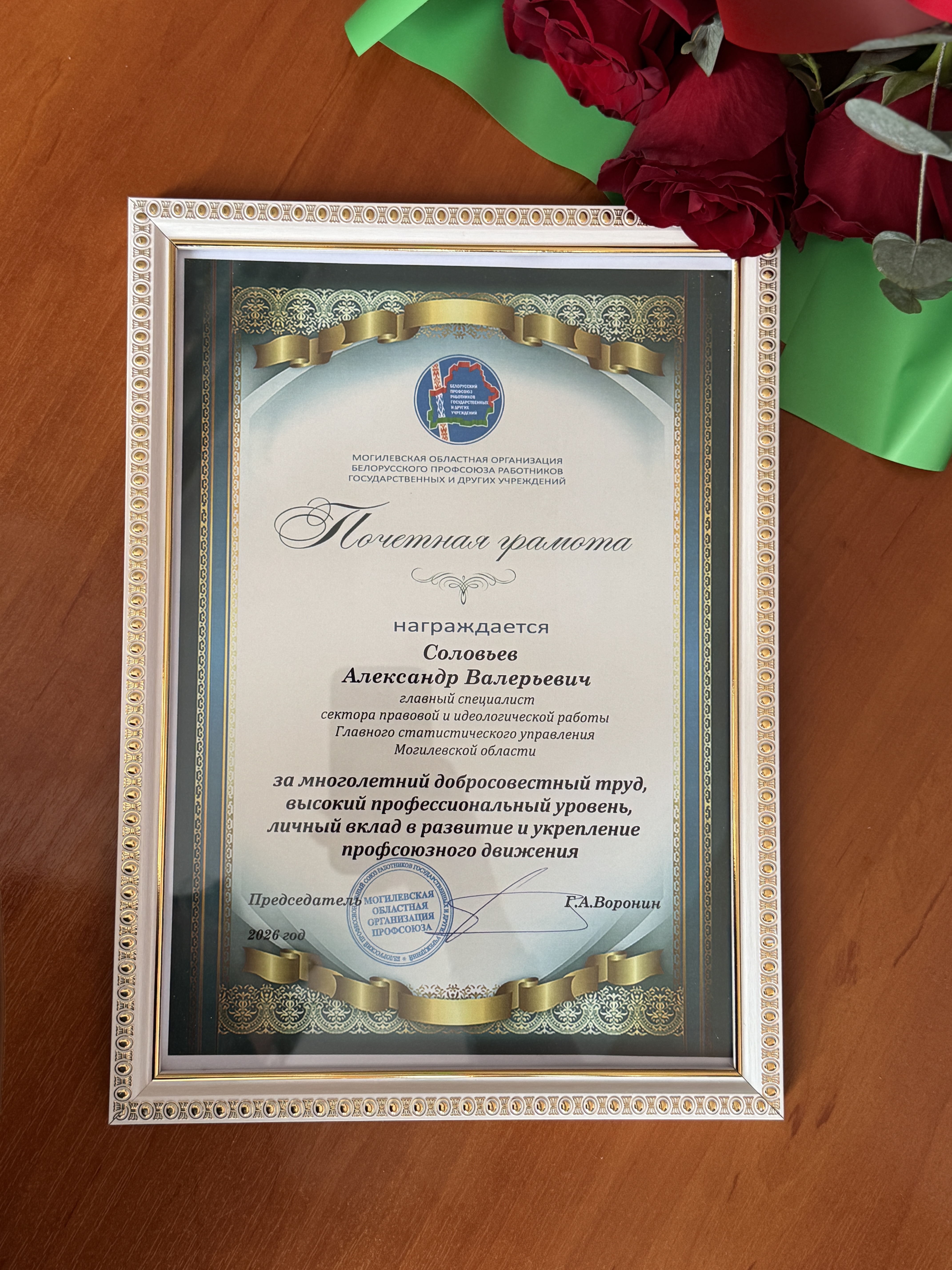 Александр Соловьев, главный специалист сектора правовой и идеологической работы, был отмечен Почетной грамотой Могилевского областного комитета Белорусского профсоюза работников государственных и других учреждений, которую торжественно вручил председатель Григорий Воронин.